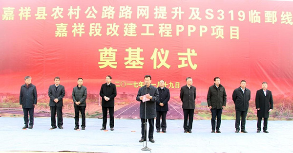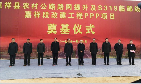 2017年11月19日上午,嘉祥县农村公路路网提升及S319临鄄线嘉祥段改建工程PPP项目奠基仪式在嘉祥县公路PPP项目所在地隆重举行。济宁市市委常委、常务副市长于永生、市交通局副局长李效忠、市公路局副局长孙明记,县委书记周生宏、县长朱瑞显、副县长赵健、县交运局局长尹哲学,中建交通建设集团有限公司董事长吴春军,山东省海洋集团董事长包剑英,中建交通建设集团有限公司投资管理公司总经理李国强,山东中网银新投资管理有限公司董事长王少鹏、总经理陆永顺,中建交通建设集团有限公司投资管理公司市场总监张志坚,中建交通(山东)公路工程有限公司董事长杨福生,中建交通(山东)公路工程有限公司总经理杜宗平,永昌集团有限公司总裁吴永隆及县直有关单位负责人、有关项目负责人等出席了仪式。仪式由县委副书记、县长朱瑞显同志主持,县交运局局长尹哲学同志介绍项目有关情况。