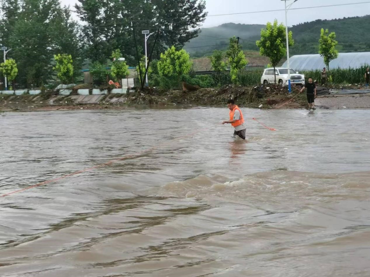 图1 项目部被洪水围困洪灾发生后,项目部立即启动应急预案,有条不紊,吹响全力救助集结号,在项目班子成员的带领下,第一时间冒雨将车辆、资料、电脑、打印机等财物转移至高处,人员全部安全撤离至山上。洪水无情,共担风雨,项目部在自救的同时,也在积极救援周边被困群众,在项目经理王传亮的带领下,与消防官兵配合,开辟出一条生命救援通道,成功将一名被困树顶、生命岌岌可危的群众解救至项目部避险。