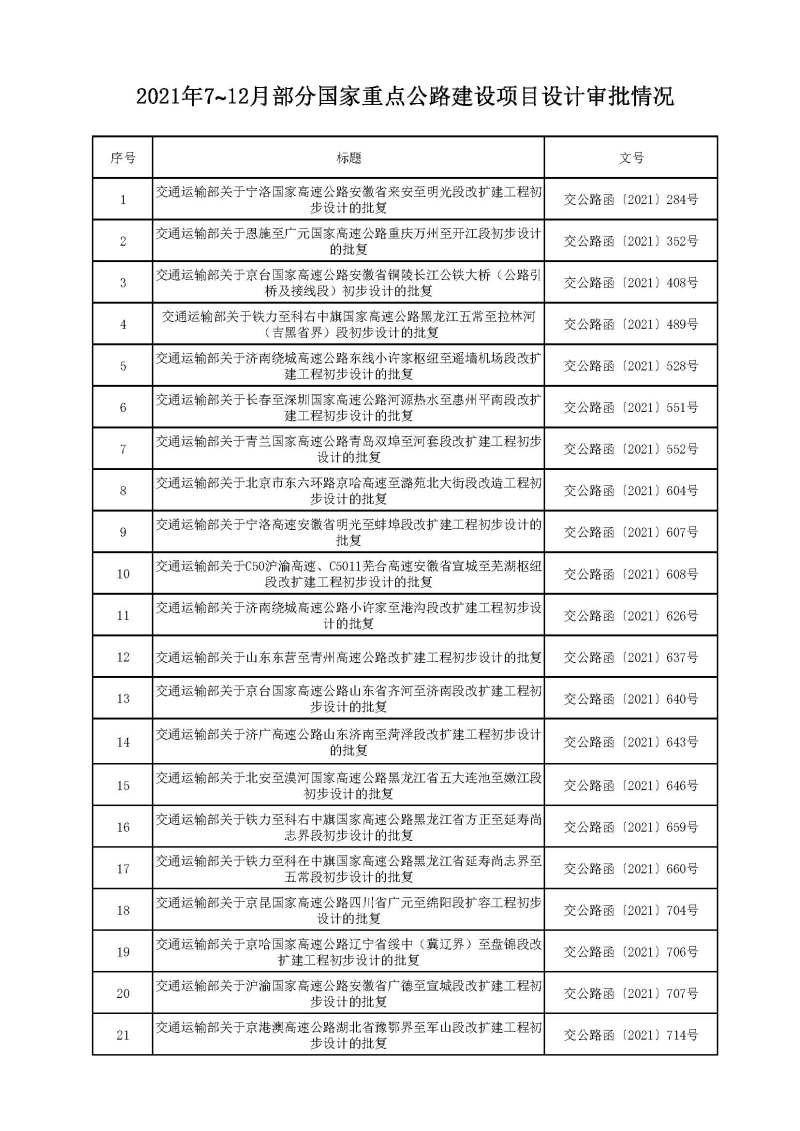 2021年7~12月部分国家重点公路建设项目设计审批情况