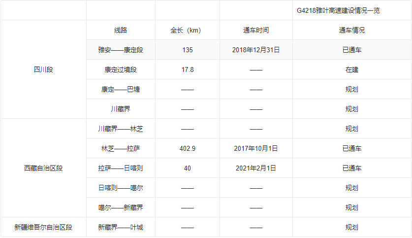 G4218 雅叶高速由四川雅安至新疆叶城,主要经过:雅安-天全-泸定-康定-理塘-巴塘-芒康-八宿-林芝-拉萨-日喀则-噶尔-叶城。跨越四川、西藏、新疆三个省。该线路大致沿川藏公路(G318 国道)和新藏公路(G219 国道)一线。