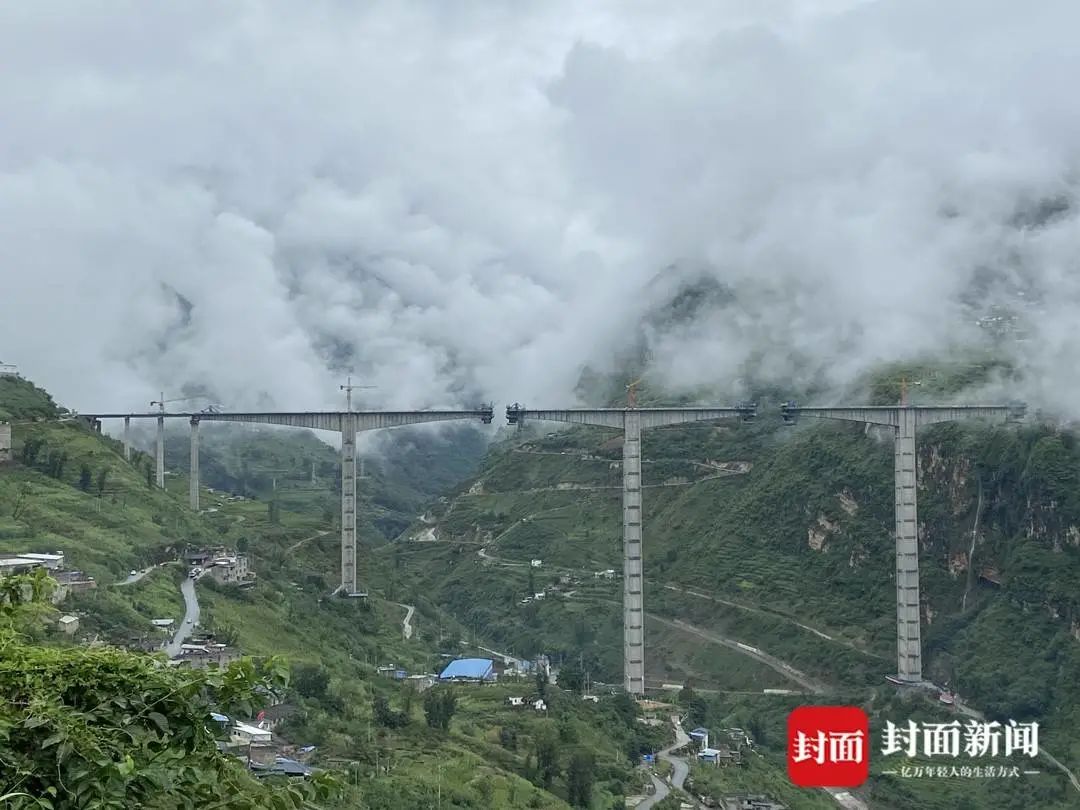 顺着桥面往下看,几根灰色立柱像擎天柱一样,插进峡谷的“心脏”,稳稳地托举起距离金阳河200多米高之外的桥梁。这座桥,一共有8个桥墩,最高的桥墩6号墩196米。