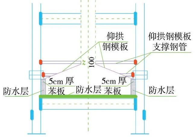 在仰拱基面处理合格后进行仰拱防水层施工,为确保中导洞侧防水的搭接,利用5cm厚苯板对防水层进行保护,在中导洞仰拱施工时去除苯板,实现防水层顺接。