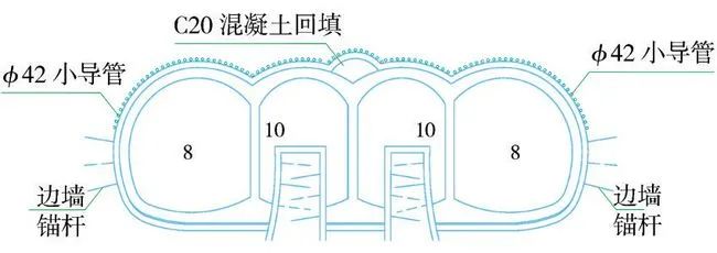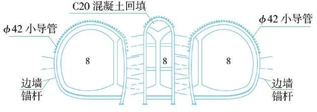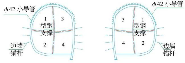 (4)第四步:在完成上述二次衬砌作业后,开始开挖介于上述3个导坑之间的尚未开挖的左右两部分土体。总体上采用从上到下的步序,首先开挖左上、右上两个导坑,同时施做型钢+挂网+锚喷初期支护,施工前先进行拱部ϕ42小导管注浆超前支护(图4)。