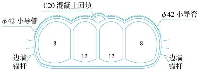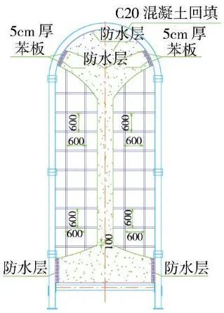 (3)第三步:在上述开挖完成的3个导坑内施做二次衬砌,施工顺序为:铺挂防水层—细石混凝土保护层—二次衬砌钢筋施工—二次衬砌混凝土施工,中导洞二次衬砌施工完毕后在其拱部回填C20混凝土(图3)。