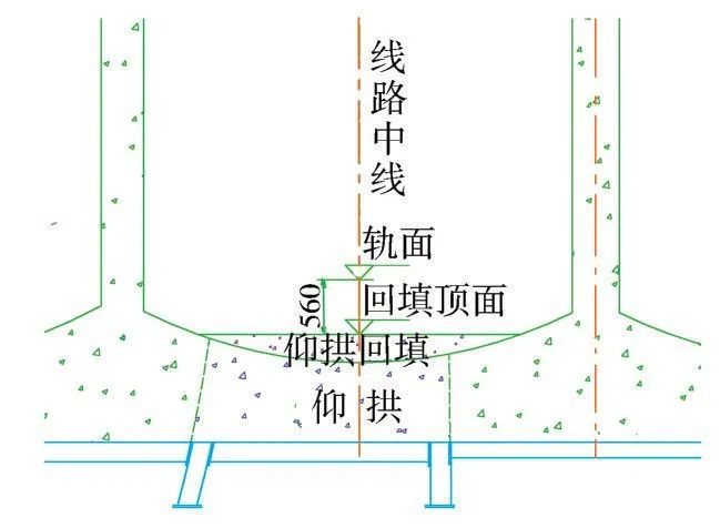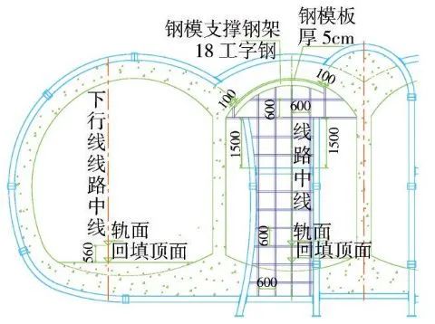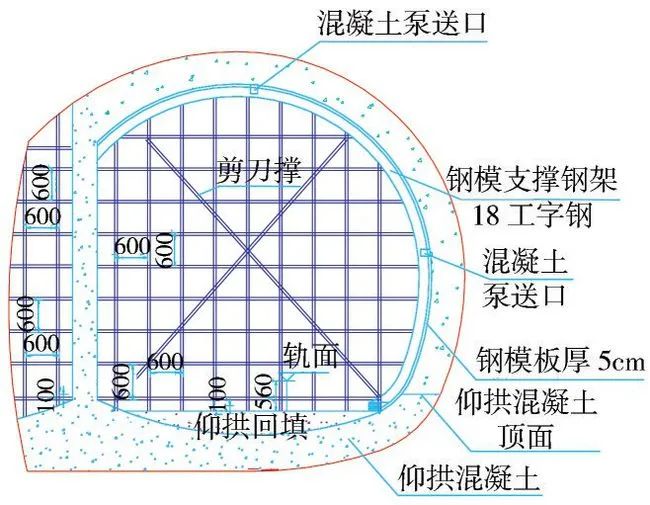 根据设计,轨面以下56cm采用C20混凝土进行回填,为便于拱墙衬砌支架搭设,在仰拱混凝土强度达到2.5MPa时进行仰拱回填施工,回填混凝土具备强度后在回填顶面加设工字钢或钢板,使竖撑和回填混凝土紧密接触,确保初期支护稳定(图10)。