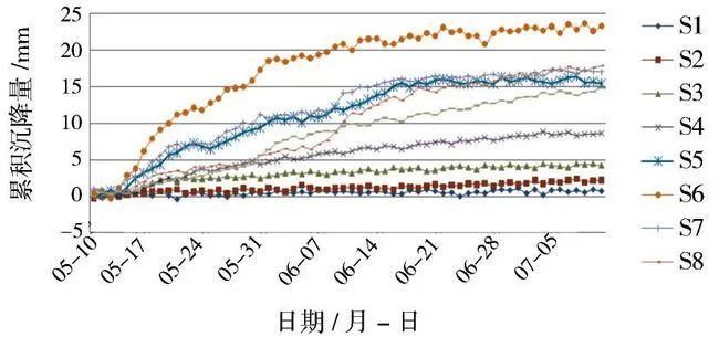 (3)及时施作二次衬砌对控制地表沉降具有明显作用。图18显示在6月3日施作二次衬砌后S5、S6、S7测点沉降曲线明显变缓。