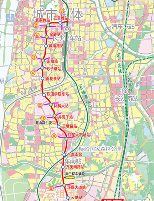 项目概况:工程起于云塘站,沿汇金路、韶山路及八一路敷设,止于五里牌站。线路长 17.308 公里,均为地下线。设站 16 座,均为地下站,其中换乘站 9 座,速度目标值为 80km/h。新建南三环双层车辆段 1 座、韶山路车检所主变电所 1 座,利用杜花路第二控制中心,大架修利用 6 号线黄梨路车辆基地。建设工期为 72 个月。