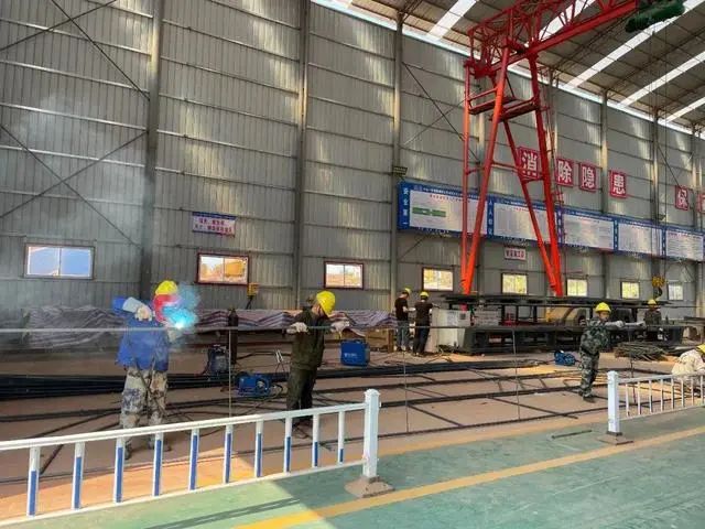 在雄信高速预制梁钢筋加工厂,工人们忙着焊接钢筋。
