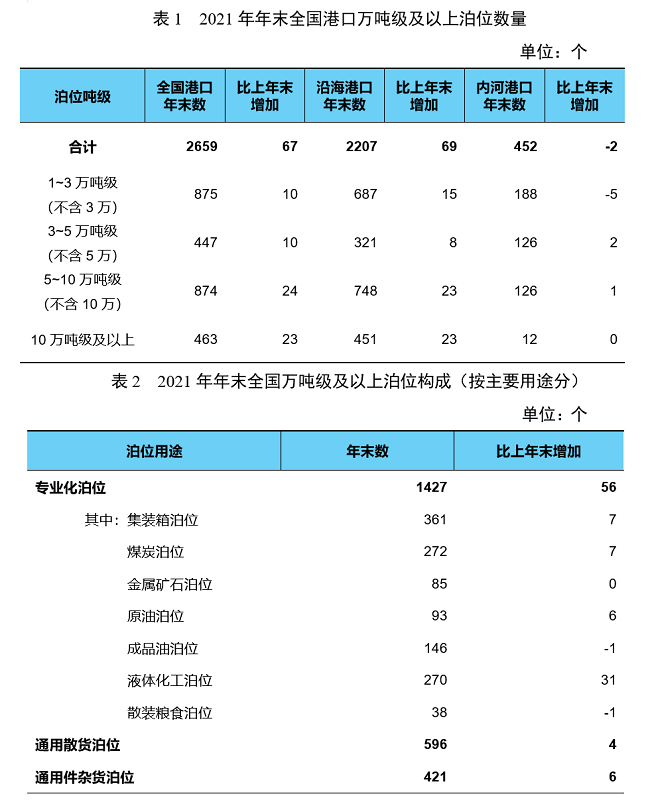 年末全国港口万吨级及以上泊位2659个,比上年末增加67个。从分布结构看,沿海港口万吨级及以上泊位2207个、增加69个,内河港口万吨级及以上泊位452个、减少2个。从用途结构看,专业化万吨级及以上泊位1427个、增加56个,通用散货万吨级及以上泊位596个、增加4个,通用件杂货泊位421个、增加6个。