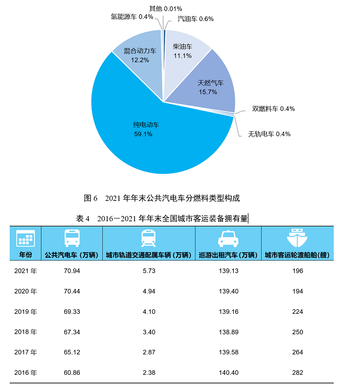 年末全国拥有城市公共汽电车70.94万辆,比上年末增长0.7%,其中纯电动车41.95万辆、增长10.8%,占整个城市公共汽电车比重为59.1%、提高5.4个百分点。拥有城市轨道交通配属车辆5.73万辆,增长15.9%。拥有巡游出租汽车139.13万辆,下降0.2%。拥有城市客运轮渡船舶196艘,增长1.0%。