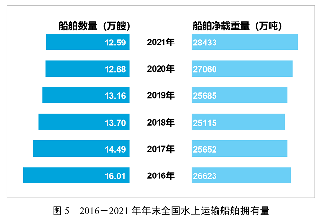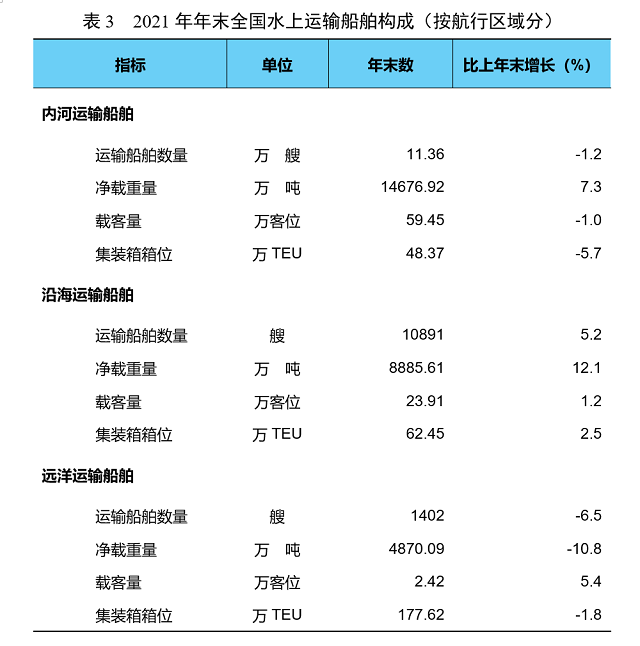 年末全国拥有水上运输船舶12.59万艘,比上年末下降0.7%,其中净载重量28432.63万吨、增长5.1%,载客量85.78万客位、下降0.3%,集装箱箱位288.43万标准箱、下降1.6%。