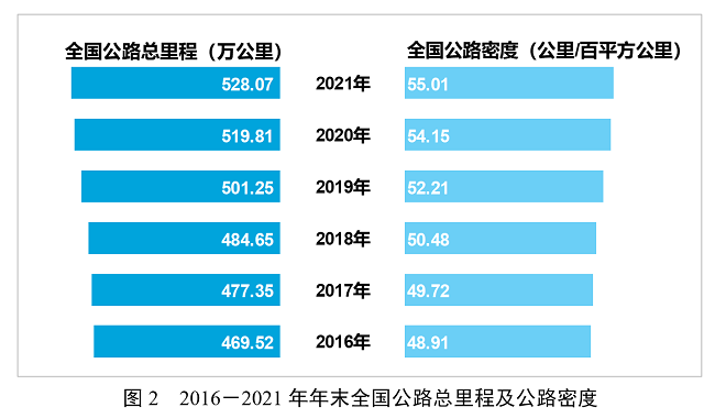 年末全国公路总里程528.07万公里,比上年末增加8.26万公里。公路密度55.01公里/百平方公里,增加0.86公里/百平方公里。公路养护里程525.16万公里,占公路总里程比重为99.4%。