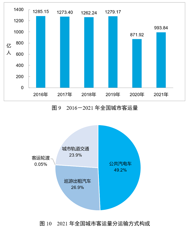 全年完成城市客运量993.84亿人,比上年增长14.0%。其中,公共汽电车客运量489.16亿人、运营里程335.27亿公里,分别增长10.6%和10.7%,城市轨道交通客运量237.27亿人、增长34.9%,巡游出租汽车客运量266.90亿人、增长5.4%,城市客运轮渡客运量0.51亿人、增长30.5%。