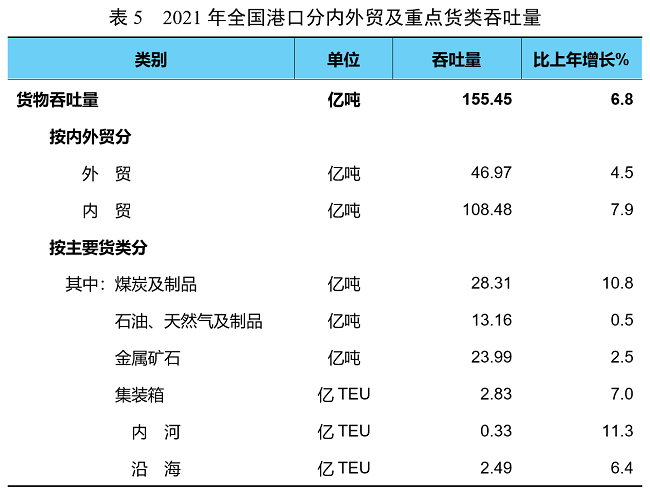全年全国港口完成货物吞吐量155.45亿吨,比上年增长6.8%。其中,内河港口完成55.73亿吨、增长9.9%,沿海港口完成99.73亿吨、增长5.2%。完成集装箱铁水联运量754万TEU,增长9.8%。