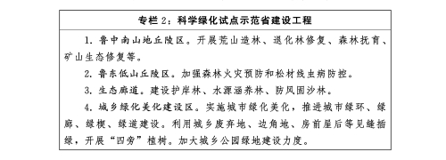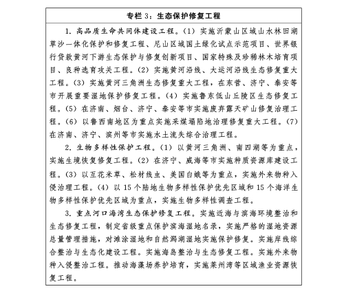 2.提升生态系统功能与品质。强化对黄河三角洲和黄河重要干支流的自然保护与功能修复,统筹实施黄河三角洲湿地与生物多样性、沂蒙山区域山水林田湖草沙等生态修复工程。坚持自然恢复为主,以黄河三角洲、南四湖、沿海等区域重要湿地为重点,修复破碎化严重、功能退化的自然湿地。扎实开展科学绿化试点示范省建设,推进沂蒙山、尼山、黄河下游等区域重点工程项目,推进国家特殊及珍稀林木培育和良种选育攻关,持续开展森林生态系统保护与修复。加强山体地质环境综合治理,对破损山体、露天采场、废弃矿井和采煤塌陷地等开展环境综合治理与生态修复,持续推进绿色矿山建设工作,开展黄河流域矿区污染治理和生态修复试点示范。