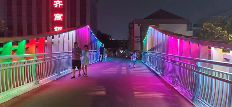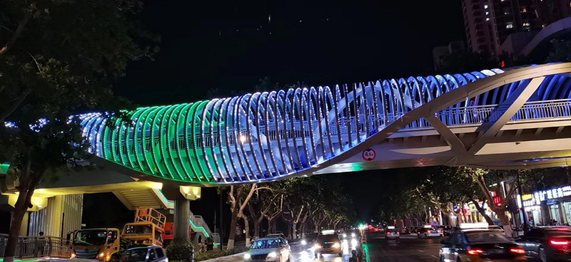 两座天桥的投入使用实现了公园、体育馆与周边居民区的交相连接,满足了城市主干道路的通行速度和以人为本的交通需求,又提高了人文关怀及观赏性。天桥的景观亮化工程,在炎炎夏日打造出绚丽多彩的都市分离式交通效果,为市民的夜生活增添一道亮丽的风景线。