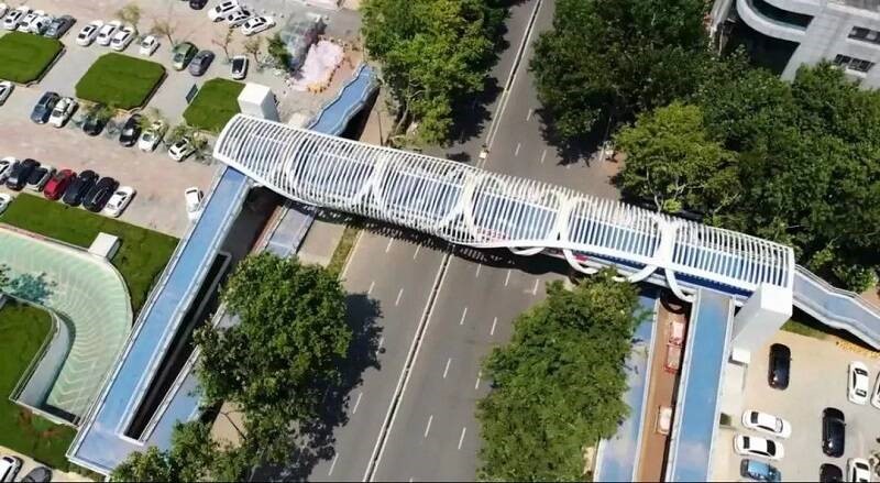 两座天桥设计均为钢结构装配式连续梁桥均配备了步行梯、垂直电梯和非机动车坡道,使锻炼、游玩的行人和过往车辆各行其道。