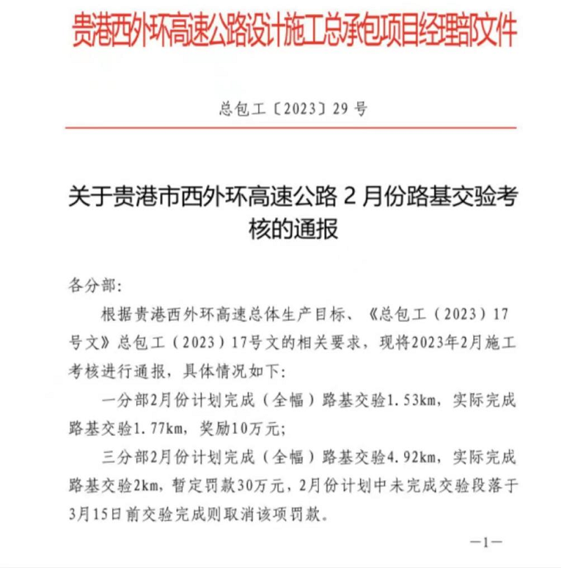 近日,由我公司参建的贵港西外环高速公路项目K1-K4等四段1.77公里路基顺利交验,超额完成计划指标,获得总承包项目经理部通报嘉奖和交验考核奖金10万元奖励。