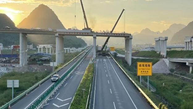 据了解,贵港西外环项目沿线分别上跨贵隆高速、209县道、平龙西干渠、鲤鱼江、358国道等重要河流及交通干线。本次上跨贵隆高速共计架设预制箱梁32片,上跨完成后,标志着贵港西外环项目所有上跨主体工程全部顺利结束,距离全桥贯通又迈进了坚实的一步,极大的鼓舞了全体参建人员的工作热情和士气。
